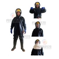 连体式设计,拉链部分防水处理,带面部防护安全帽,四肢活动灵活。配合防水面罩使用,穿脱方便,隔热效果好。